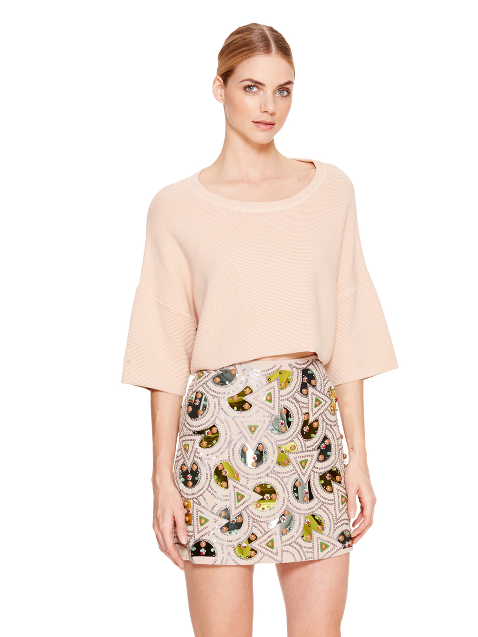 Para as apreciadoras de peças mais quentinhas, um lindo top pullover em caxemira de seda e com umas mangas largas e chiques, num maravilhoso tom rosa pálido. Este top pullover custa agora 83,90 euros.