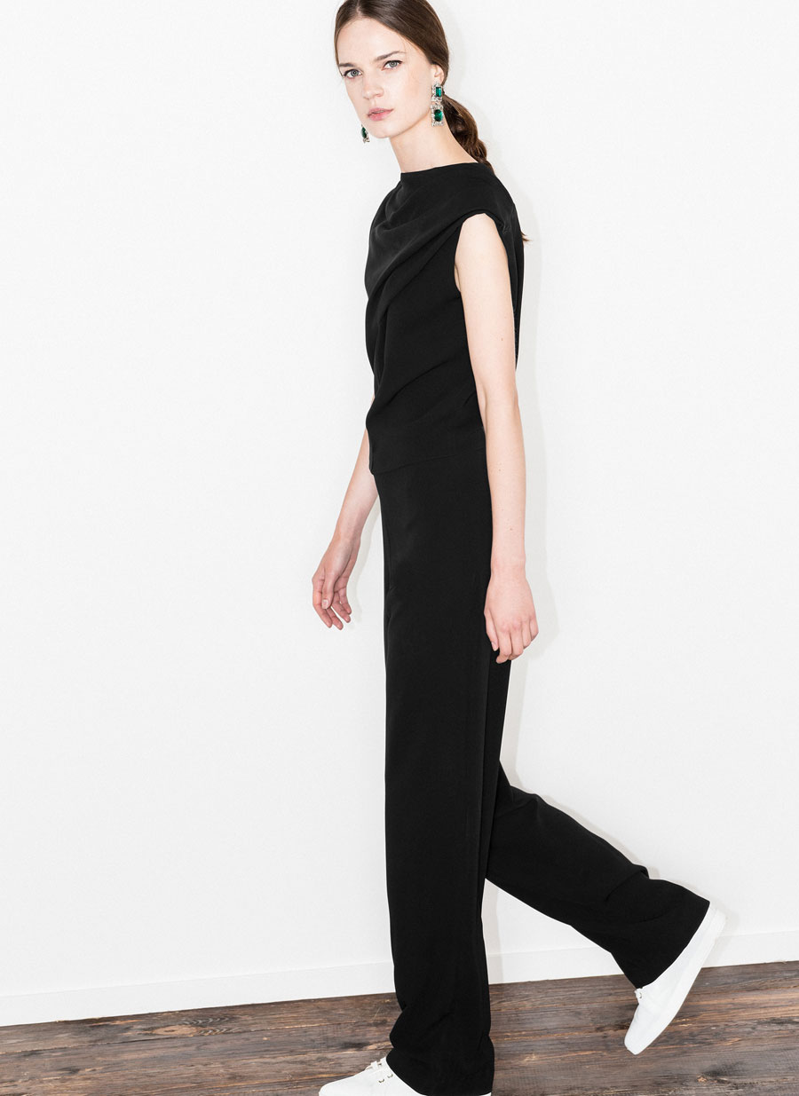 Macacão em viscose; design sem mangas com cava caída e um ombro com drapeado; corte direito com fecho de correr invisível atrás e colchete na parte superior, com forro interior elástico.