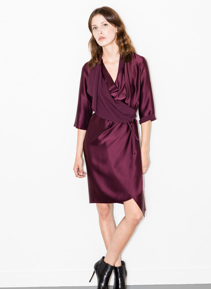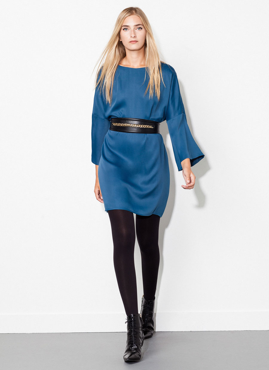 Vestido confecionado em tecido fluido com acabamento acetinado. É um design que se destaca por estar realizado numa só peça sem costuras, com gola plissada, com manga comprida e cinto que permite um ajuste à cintura em modo laço. Simplesmente maravilhoso.