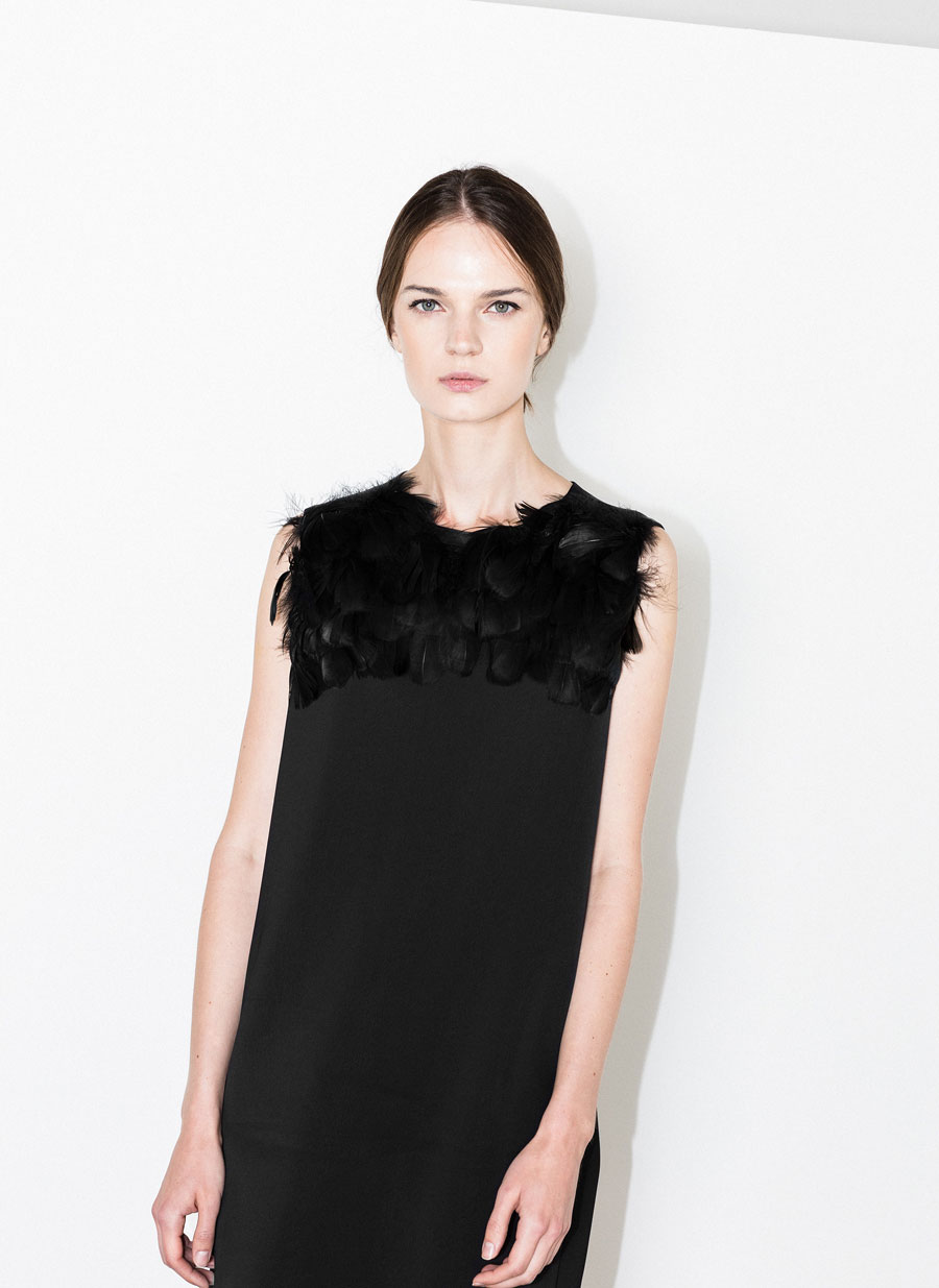 Vestido em tecido duplo acetinado; design sem mangas com penas naturais bordadas no decote; corte direito e bolsos nos lados; fecho de correr invisível atrás e colchete na parte superior.